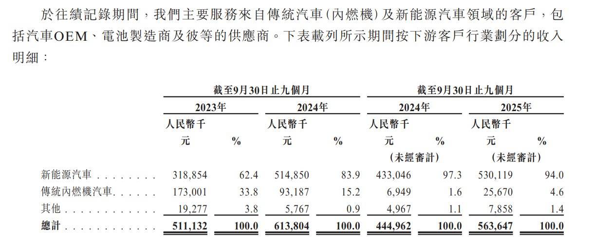 2024年时,上海君屹来自新能源汽车的收入占比为83.9%,同比提升21.5个百分点,至2025年前三季度,该比例已提升至94%。而来自传统内燃机汽车的收入占比则快速下滑,从2023年的22.8%降至2024年的15.2%,2025年前三季度则降至4.6%。