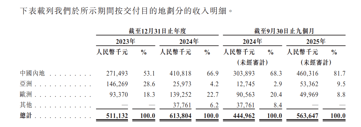 此外,能否进一步证明公司在全球化方面的潜力,将成为影响上海君屹估值水平的又一关键性因素。上海君屹于招股书中表示,公司致力于构建全面的海外销售与服务网络,深化在成熟的欧洲及北美市场的渗透。但从按地区划分的收入结构来看,其全球化进展与战略表述之间存在一定落差。